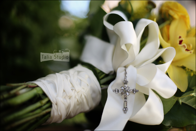The bride's bouquet beautifully displays her grandmother's jewelry
