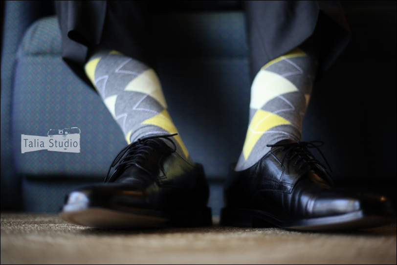 Argyle socks reflect the fun spring-time wedding theme of yellow and gray